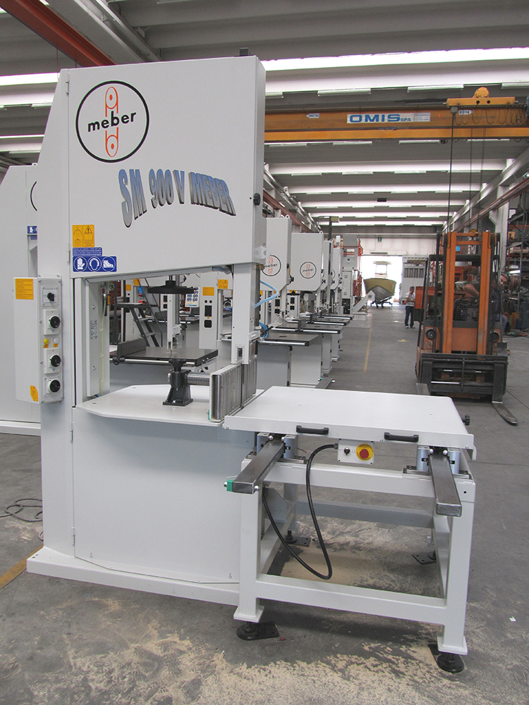 This is a traditional band saw with a special blade and blade guide for a special type of operation whereby the blade can be turned by 90°, thus avoiding obstacles normally found when cutting cumbersome materials due to the limited cutting width of traditional machines. The machine features two large worktables, one fixed on the left and one on a moving carriage to the right, which moves to convey the piece to be cut towards the blade. The panel featuring the power controls is fitted to the carriage in a practical and ergonomic position for the operator. |